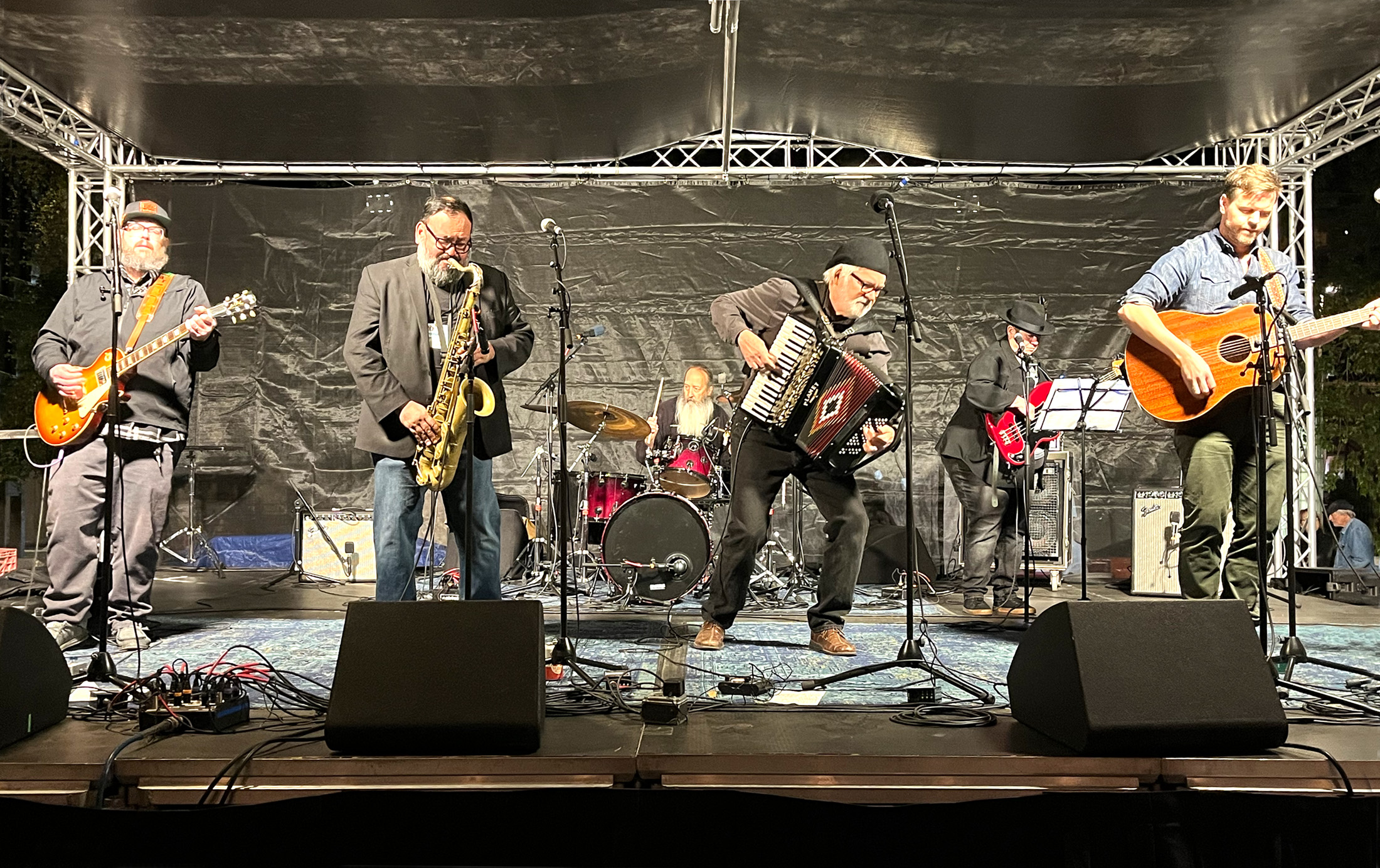 After a twenty year run with the Carnivaleros, the band name has been retired. Read all about it here. On board were Gary Mackender on accordion and vocals, Karl Hoffmann on bass and vocals, Joe Fanning on electric and acoustic guitars, baritone, and mandolin, Björgvin Benediktsson on acoustic guitar and vocals, Les Merrihew on drums, and special guest Alex Flores on sax.