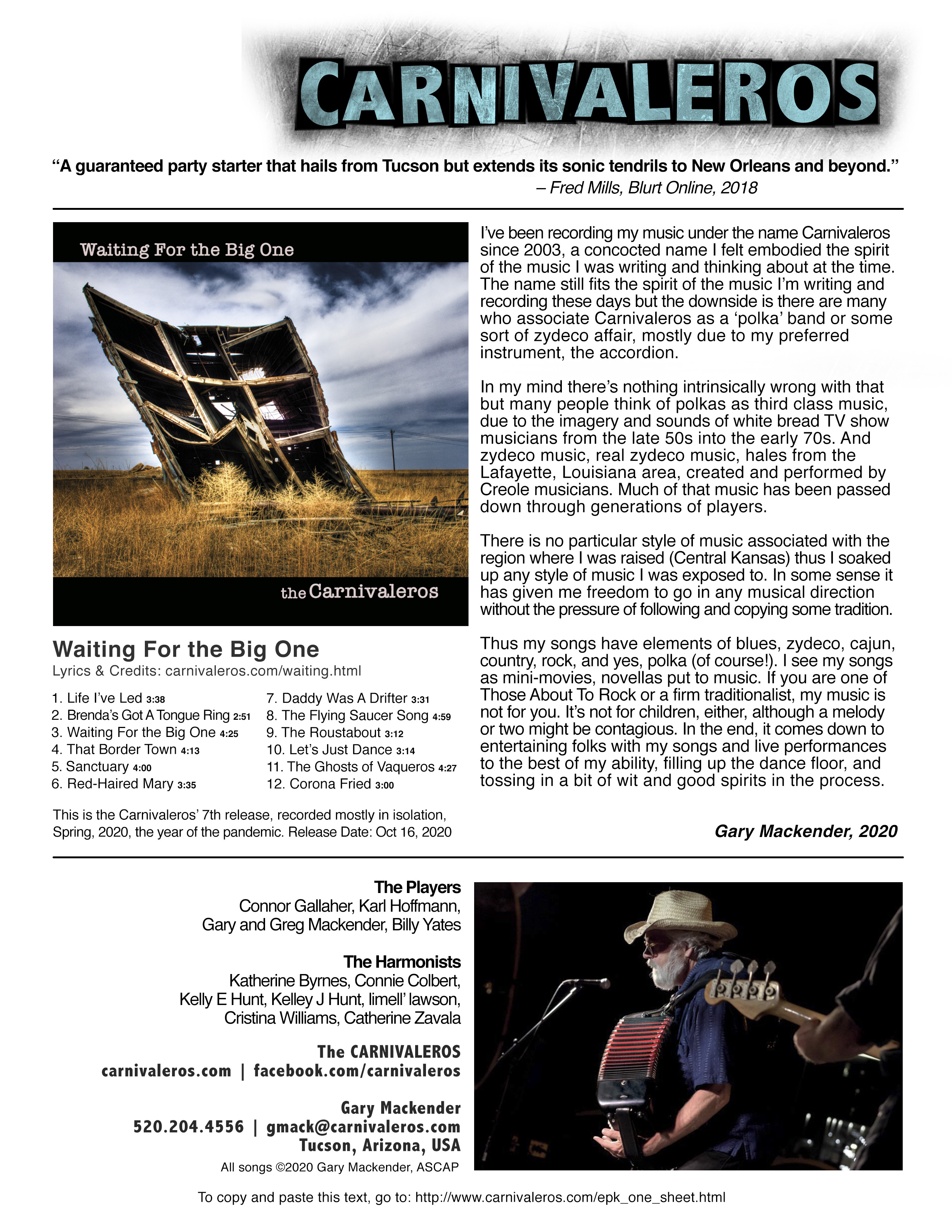 This is the Carnivaleros’ 7th release, recorded mostly in isolation, Spring, 2020, the year of the pandemic.